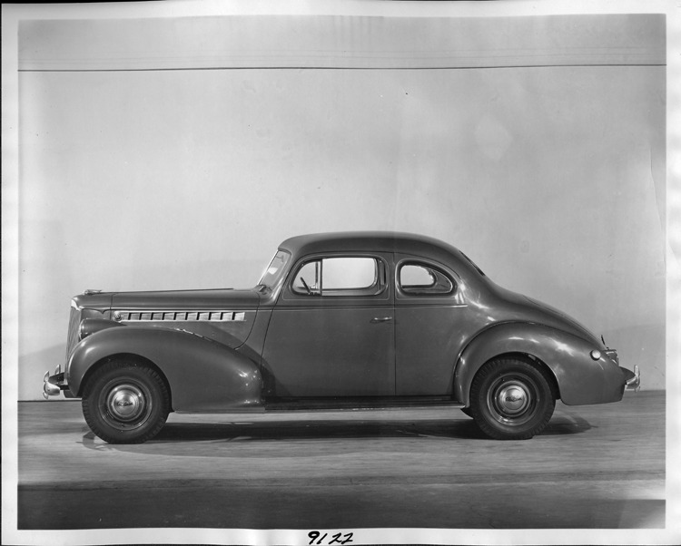 8x10 black and white Packard Co. file photograph of a 1940 Packard left side view. Inscribed on photo back: Packard one twenty, eighteenth series, model 1801, 8-cylinder, 120-horsepower, 127-inch wheelbase, 2/5-person club coupe (body type #1395), prototype, early 18th series production features only features; tapered bumper ends, louver panel medallion, hub caps, non-production features; absent parking lamp, absent stamping around side windows.
