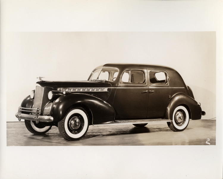 8x10 black and white sepia-toned Packard Co. file photograph of a 1940 Packard three-quarter left side view. Inscribed on photo back: Packard one sixty, super eight, eighteenth series, model 1803, 8-cylinder, 160-horsepower, 127-inch wheelbase, 5-person club sedan (body type #1376), mid-season 18th series production, note A) mid-season features; hub caps, B) optional equipment; dual white sidewall tires.