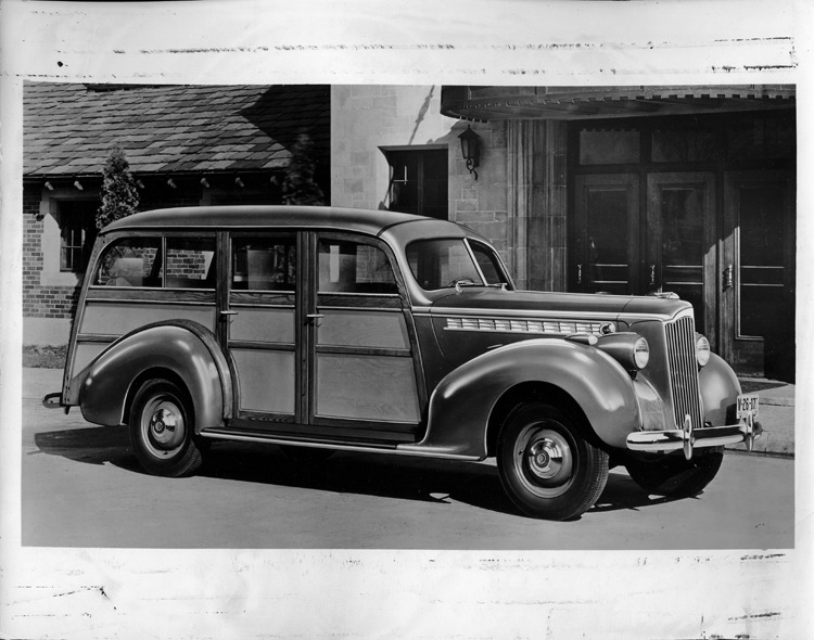 8x10 black and white Packard Co. file photograph of a 1940 Packard seven-eights right side view. Inscribed on photo back: Packard one ten, eighteenth series, model 1800, 6-cylinder, 100-horsepower, 122-inch wheelbase, 8-person station wagon (body type #1383), built by Hercules Body Co. Evansville, Ind., early 18th series production retouched to suggest some mid-season changes, note traditional style '120' hub caps, rounded bumper ends, 9-vent louver panel' medallion unaltered (remains early production style), 1939 Michigan license plate #V-26-17.