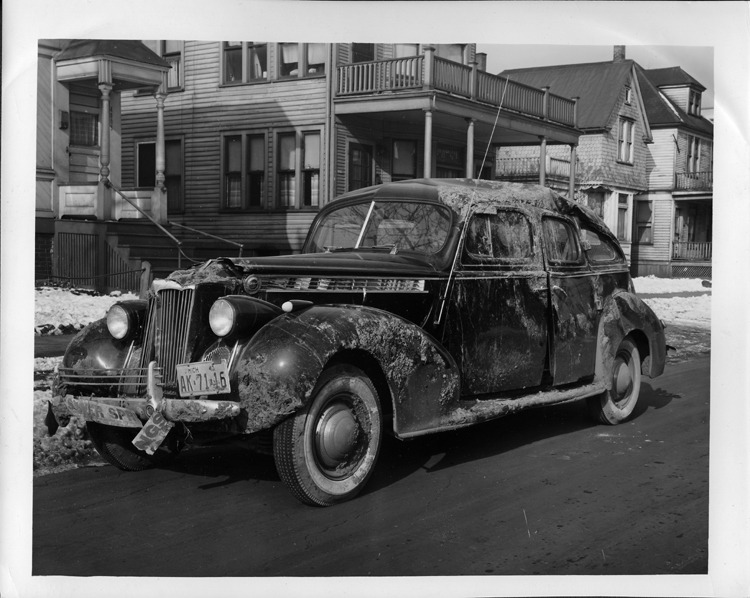 1940 Packard touring sedan, driver's side, parked on street, covered in mud