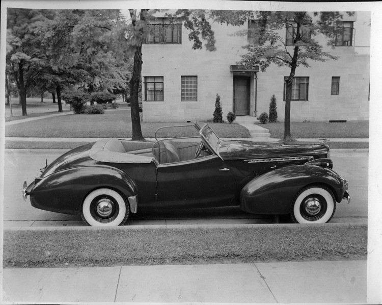 1940 Packard convertible victoria, right side view, top folded, parked on street