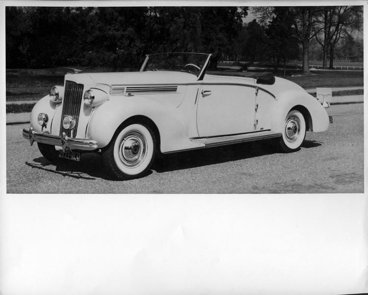 8x10 black and white Packard Co. file photograph of a 1940 Packard eight, three-quarter left front view, top folded, parked on drive, light in color, white sidewall tires. Body by Franay of Paris.