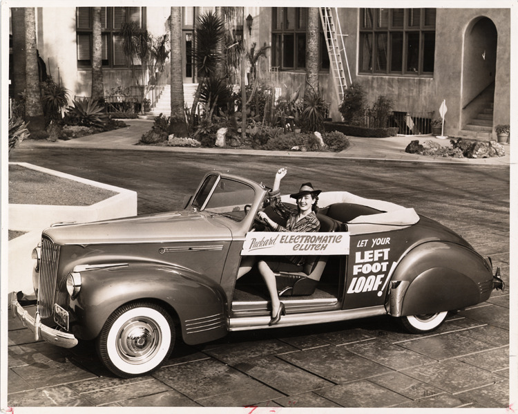 8x10 black and white sepia-toned Packard Co. file photograph of a 1941 Packard nine-tenths left side view, top folded, female behind wheel, signs on car read 'Packard Electromatic Clutch let your foot loaf.' Inscribed on photo back: Packard one ten, nineteenth series, model 1900, 6-cylinder, 100-horsepower, 122-inch wheelbase, 5-person deluxe convertible coupe (body type #1489DE), fitted with feather & fabric upholstery option, special show car: doors removed so as to emphasize advantages of Packard's Electromatic Clutch, note California license plate.