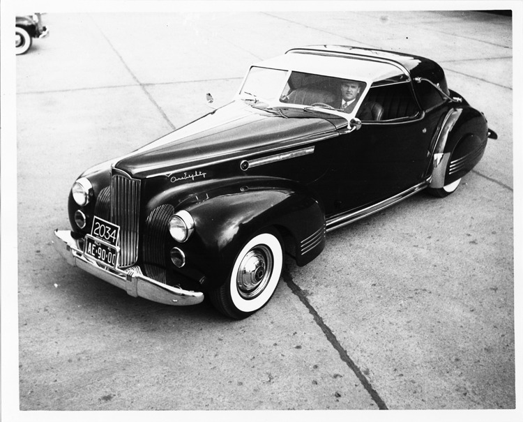 1941 Packard convertible victoria, three-quarter left front view, top raised, male behind wheel