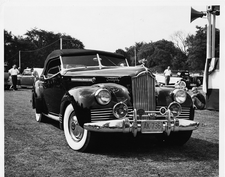 8x10 black and white Packard Co. file photograph of a 1942 Packard front view, top raised, parked on grass, possibly at a classic car show. Inscribed on photo back: Packard one eighty, custom super eight, twentieth series, model 2006, 8-cylinder, 165-horsepower, 127-inch wheelbase, 5-person convertible victoria (body type #1529), by Darrin, Packard approved accessories; deluxe emblem, radio, grille guard, chrome wheel trim rings, note special fitments; special lamps, chrome tail lamp housings, 1960 Ohio license plate #AK-736.