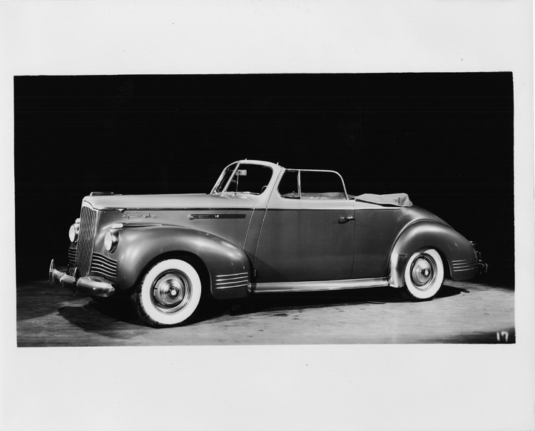 8x10 black and white sepia-toned Packard Co. file photograph of a 1942 Packard nine-tenths left front view, top folded. Inscribed on photo back: Packard one ten, twentieth series, model 2020, 6-cylinder, 105-horsepower, 122-inch wheelbase, 5-person convertible coupe (body type #1589), prototype, note non-production hub cap, position of license plate bracket, carry over tail lamp.