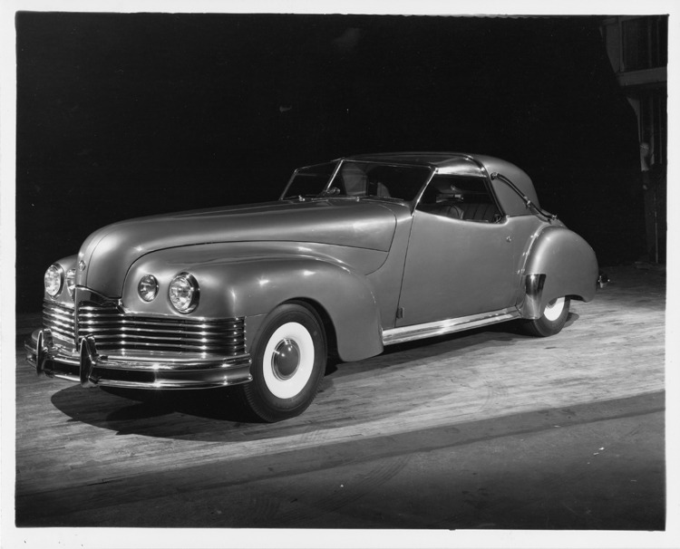 8x10 black and white Packard Co. file photograph of a 1944 Packard nine-tenths front left view, dual white sidewall tires. Inscribed on photo back: Packard 'Brown Bomber,' a special sports car developed by Edward Macauley.