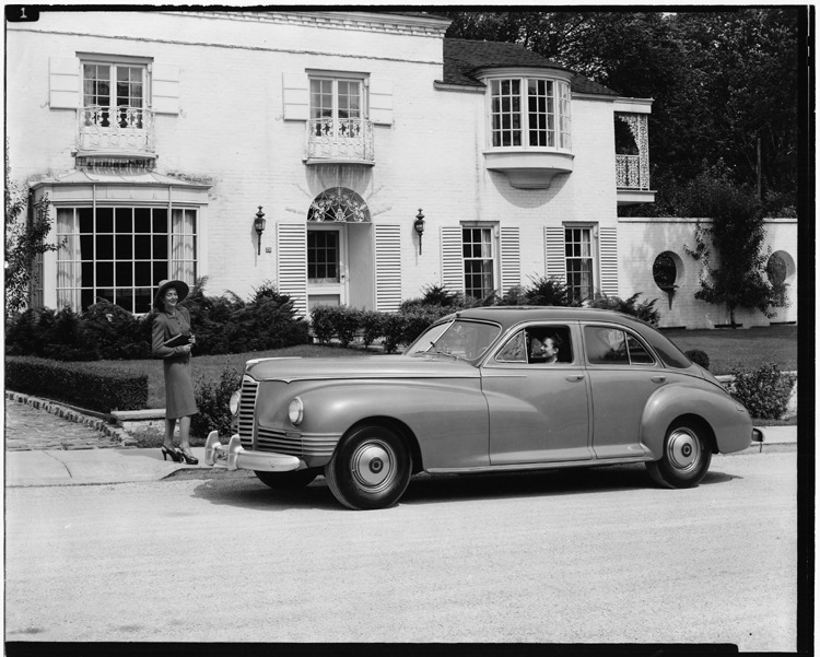 8x10 black and white Packard Co. file photograph of a 1946 Packard seven-eights left side view, parked on drive in front of house, female behind wheel, female standing at front of car. Inscribed on photo back: 1946 Packard Clipper six, touring sedan.