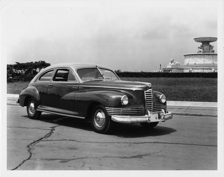 8x10 black and white Packard Co. file photograph of a 1946 Packard three-quarter front view, parked on drive, Scott fountain on Belle Isle in right background. Inscribed on photo back: 1946 Packard twenty first series, Clipper deluxe eight, one-twenty.