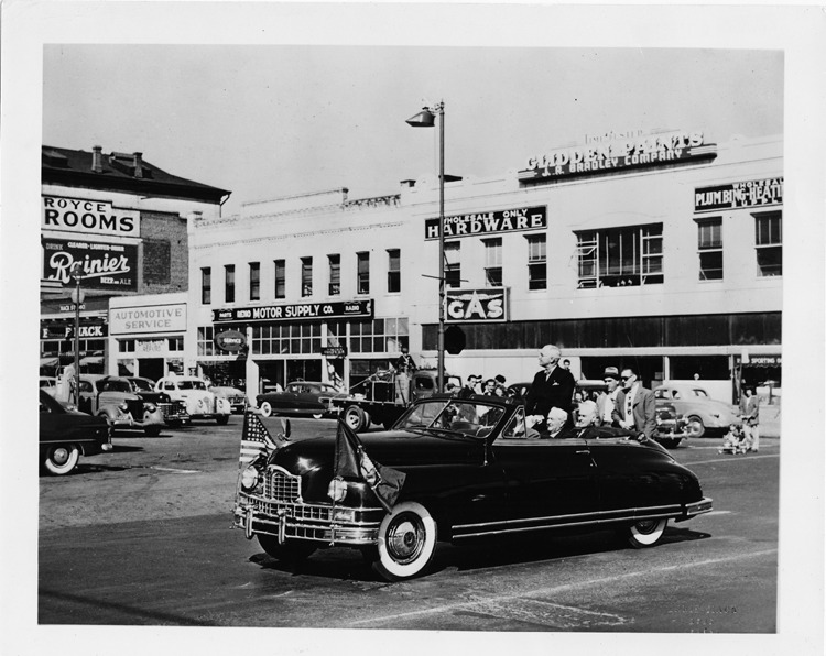 8x10 black and white Packard Co. file photograph of a 1948 Packard convertible, President Truman in back, taken during parade in a city setting, top folded, two flags affixed to front of car, several cars, people, and buildings in background. Inscribed on photo back: 1948 Packard, two great rivals, both in custom convertibles; 1948 presidential candidates Dewey (a) and Truman (b).
