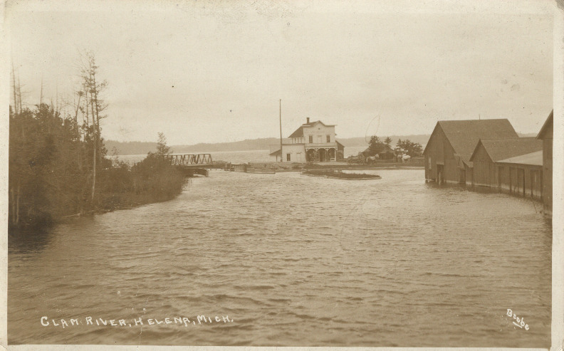 Black and white postcard of Clam Lake and its boathouses, leading into Clam River and the bridge, and then into Torch Lake. Horses stand in front of a building to the north of the bridge ca. 1910