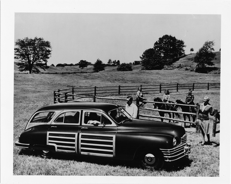 8x10 black and white Packard Co. file photograph of a 1948 Packard nine-tenths right side view, female behind wheel, male passenger, parked in field near family with horses. Photo caption on back from Packard News Service: the all new 1948 Packard station sedan, with new 'free flow' styling and a new 130-horsepower straight eight engine, is the first such vehicle in the industry to have an all steel body and an all steel top, socially acceptable anywhere, as well as utilitarian, the station sedan has four doors and two full size seats of welded steel tube construction, fine grained hardwood decorates the exterior of the doors, window panels and tail-gate, Packard engineers say the station sedan is a free of rattles as any other closed car.