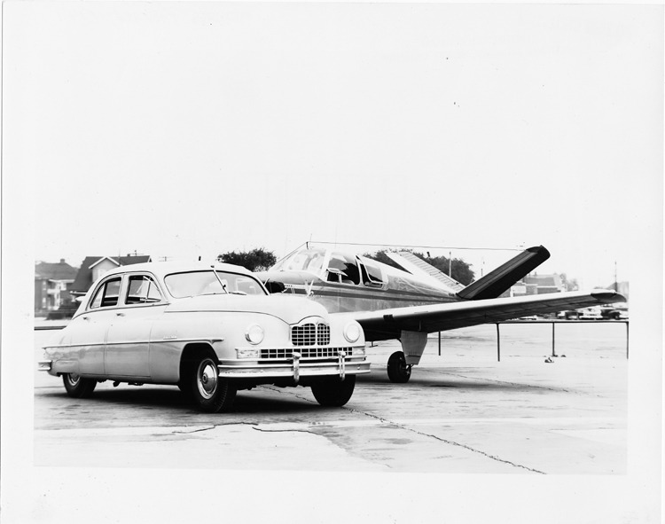 1949 Packard sedan parked on airstrip in front of single-engine airplane