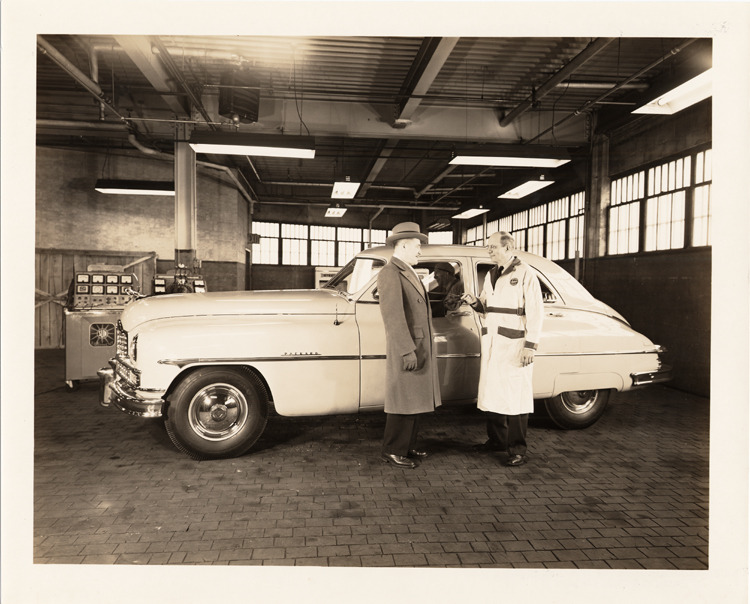 8x10 black and white sepia-toned Packard Co. file photograph of a 1950 Packard left side view, pelican emblem, 4-door, Mike Kollins & T.W. Nerthey standing at driver's door, photographed in some type of garage. Inscribed on photo back: 1950 Packard model 2306 sedan, Mike Kollins & T.W. Nerthey.