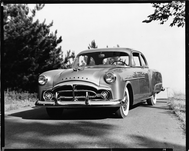 8x10 black and white Packard Co. file photograph of a 1951 Packard front view, dual white sidewall tires, parked on hill. Inscribed on photo back: 1951 Packard 200, 2-door sedan.
