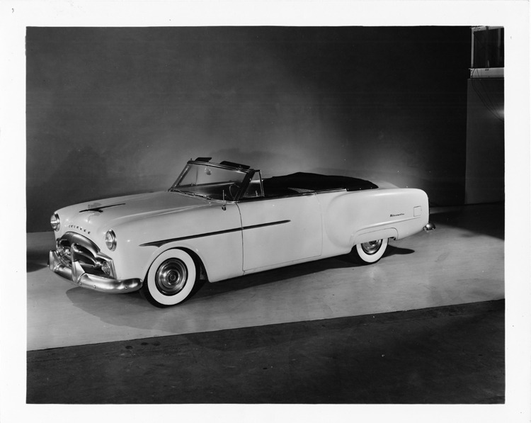 8x10 black and white Packard Co. file photograph of a 1951 Packard nine-tenths left side view, top folded, dual white sidewall tires, 2-door. Inscribed on photo back: 1951 Packard 250, convertible.