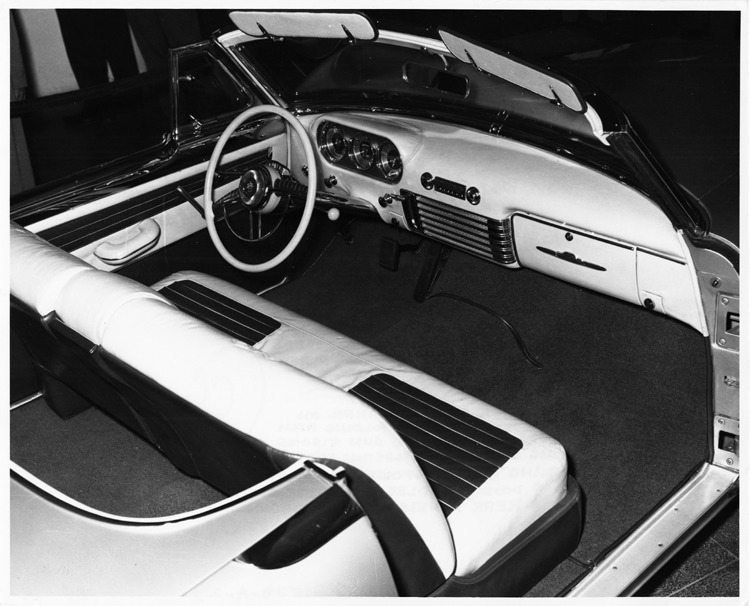 8x10 black and white Packard Co. file photograph of a 1952 Packard view of interior from right elevation. Inscribed on photo back: 1952 Packard 'Pan American' sports car, twenty-fifth series, model 2531 (modified 250 convertible, 6-person, Body type #2579), 8-cylinder, 185-horsepower, 122-inch wheelbase, special show car, first of six designed by Richard Arbib built by Henney, note fully trimmed rear panels of seat backs, interior: top grain oyster white leather on seats, dash, door panels, sun visors & steering wheel, contrasting leather on steering wheel spokes, door trim panels, door handles, pleated seat sections, rear panels of seat backs, this first Pan American exhibited International Motor Sports Show opened 29 March 1952 at Grand Central Palace, New York, N.Y.