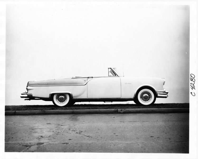 8x10 black and white Packard Co. file photograph of a 1954 Packard Caribbean convertible, right side view, dual white sidewall tires, wire wheels, 2-door.