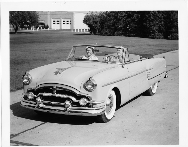 1954 Packard convertible, three-quarter front left view, top folded, two females in front seat