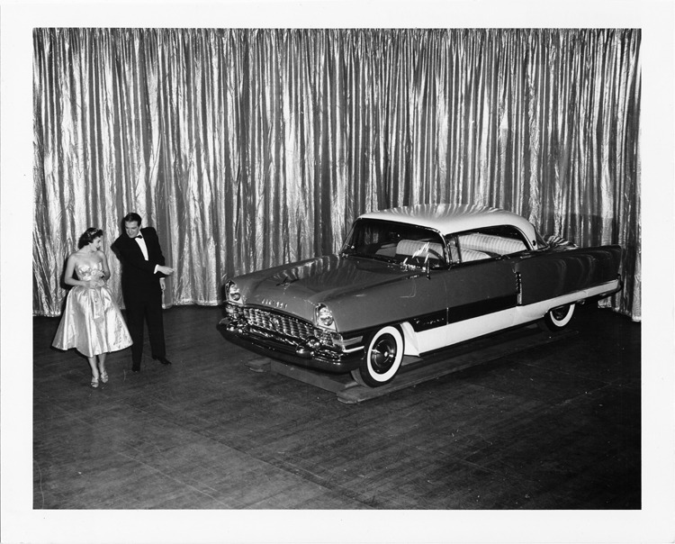 1955 Packard Clipper Constellation, on display, couple standing at front of car
