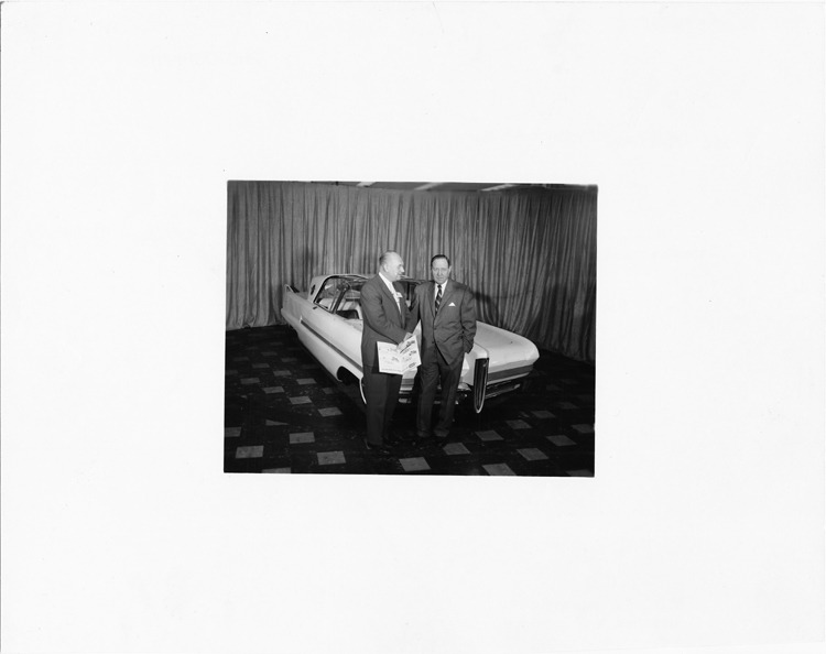 8x10 black and white Packard Co. file photograph of a 1956 Packard front view, two men standing at front of car. Inscribed on photo back: 1956 Packard 'Predictor' show car, standing: left; unidentified male holding Clipper catalog, right; J.J. Nance.