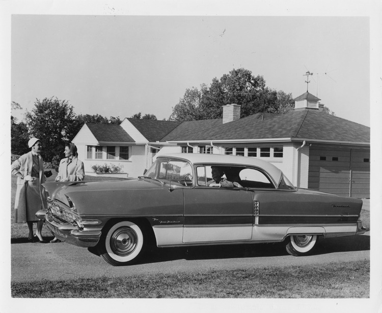 8x10 black and white Packard Co. file photograph of a 1956 Packard sedan, left side view, woman behind wheel, two women standing at front of car, parked in driveway. Inscribed on photo back: this new Packard 400 model offers elegant and stately styling and an improved torsion bar suspension system, the ride and comfort advance pioneered on American cars by Packard in 1955 models, for 1956 new Packards offer two major engineering advances that will be auto industry firsts, an electrically activated push button automatic transmission, and a non-slip differential, representing the first basic change in differential design in more than 30 years, the non-slip differential eliminates driving nuisances such as getting stuck in snow, on ice, in mud, and other adverse driving situations, most important, it contributes to the ultimate to date in safe, secure road ability when a car goes around corners or sharp curves, the non-slip differential senses which rear wheel needs and can utilize tractive power, and makes a transmission of power accordingly.