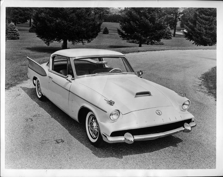 8x10 black and white Packard Co. file photograph of a 1958 Packard three-quarter front view. Photo caption on back from Packard Public Relations Dept.: 1958 Packard Hawk, fifty-eighth series, model 58-L, 8-cylinder, 275-horsepower (289-cubic inch), 120-inch wheelbase, (2-door) 6-person hardtop (body type K-9), V-8 supercharged 289-cubic inch engine generating 275-horsepower with luxury leather interior.