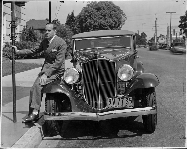7.5x9.5 black and white Packard Co. file photograph of a 1932 Packard front view, parked in street, owner Al Jolson sitting on front passenger side fender. Inscribed on photo back: 1932 Packard light eight, model 900, ninth series eight, 8-cylinder, 110-horsepower, 127.75-inch wheelbase, 2/4-person coupe roadster (body type #559); note: 1932 California license plate #9V-77-35, Packard deluxe emblem.