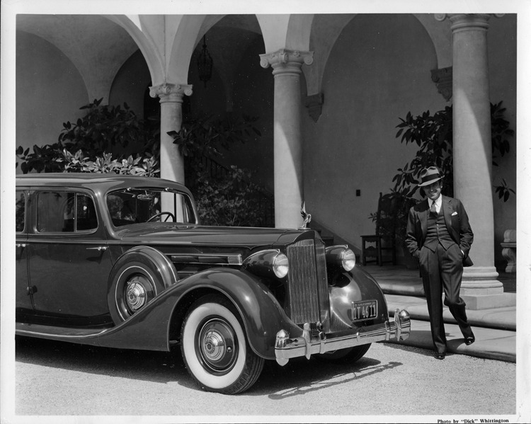 8x10 black and white Packard Co. file photograph of a 1935 Packard three-quarter right side view, owner, film star Harold Lloyd, standing near front of car. Inscribed on photo back: 1935 Packard twelve, model 1207, twelfth series, 12-cylinder, 175-horsepower, 139-inch wheelbase, 5-person sedan (body type #833), note: bumper guards, license plate frame (1935 California plate #1T-46-11), pelican emblem, white sidewall tires, 6-wheel equipment.
