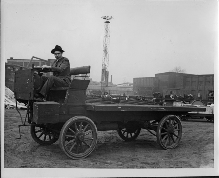 8x10 black and white Packard Co. file photograph of a 1910 Packard left side view, man in driver's seat, parked in industrial yard. Inscribed on photo back: ca. 1910 first Packard truck.