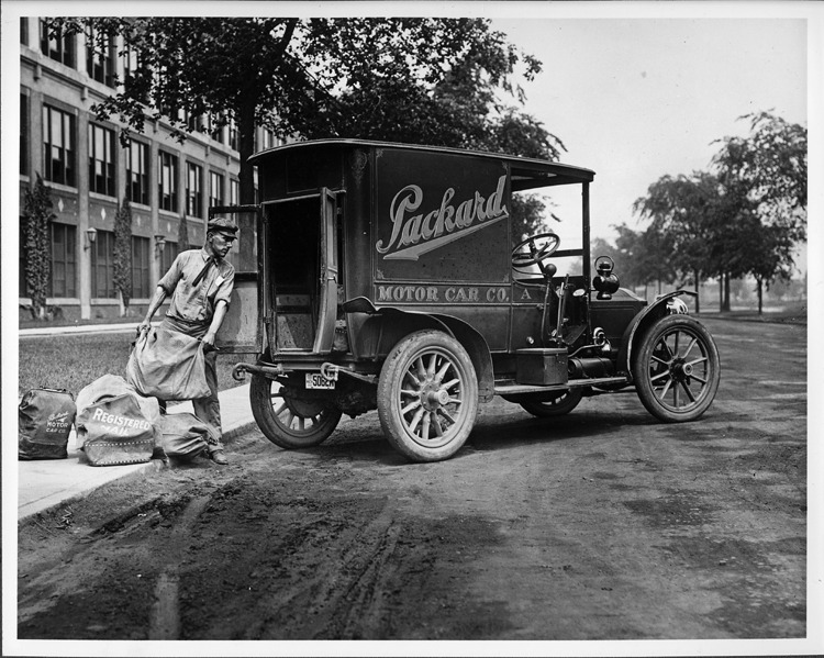 1910 Packard truck, parked on road, man loading mail into back of truck