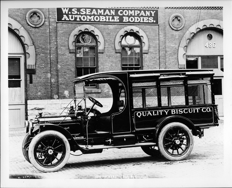 8x10 black and white Packard Co. file photograph of a 1914 Packard truck, left side view, enclosed back, partially enclosed front cab, side reads 'Quality Biscuit Co.,' parked in street next to building, sign on building reads 'W.S. Seaman Company Automobile Bodies.'