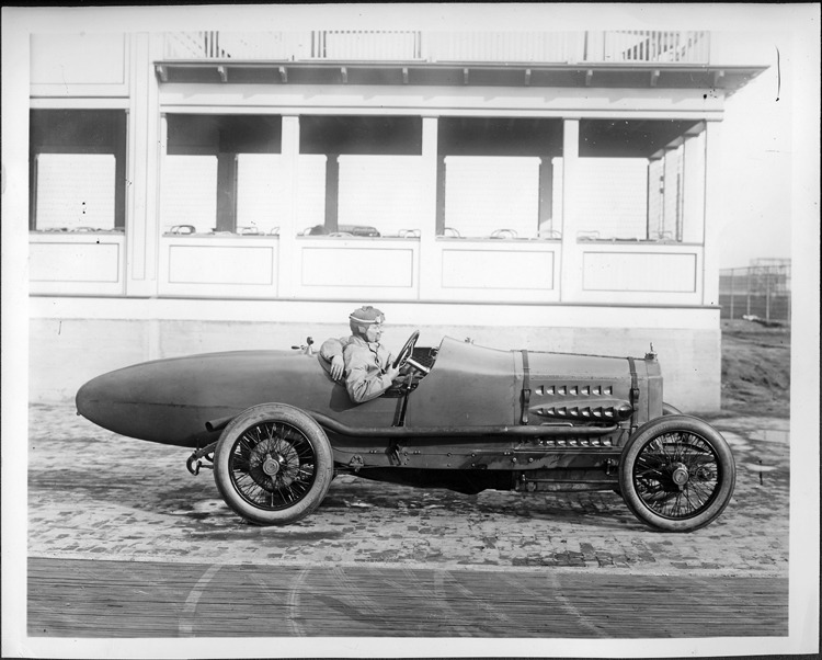 8x10 black and white Packard Co. file photograph of a Packard left side view, wire wheels, large exhaust pipe running length of car, parked on track, building in background, two men inside car wearing caps with goggles. Inscribed on photo back: '299' Packard '500' race car, #1 airplane 60 degree-V prototype engine.