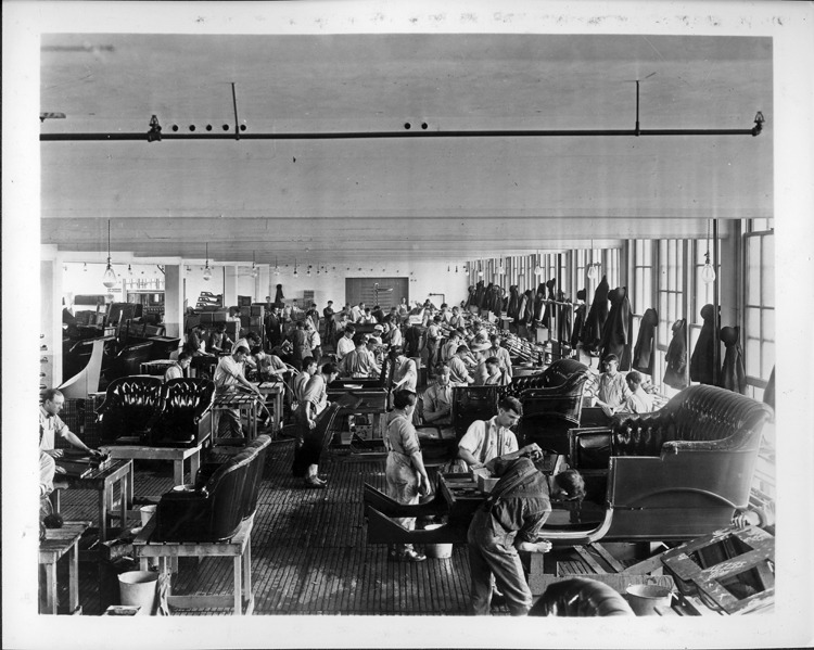 8x10 black and white Packard Co. file photograph of the 1910 Packard assembly room, several men working on car bodies. Inscribed on photo back: 1910 Packards, assembly of 'thirty' touring car & eighteen open car bodies, note no fore doors.