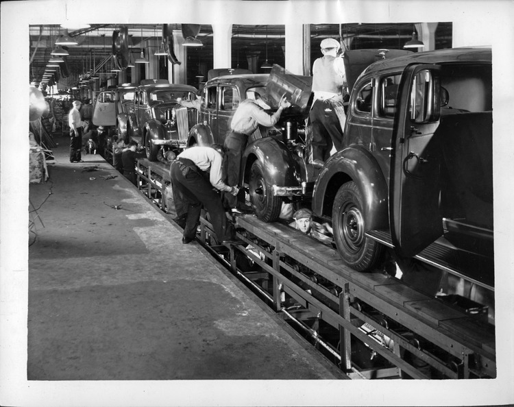 8x10 black and white Packard Co. file photograph of 1935 Packard final assembly line, several sedans with workers on line. Inscribed on photo back: Packard Motor Car Co., final assembly, completing examples of the 1935 Packard one-twenty, twelfth series, model 120, 8-cylinder, 110-horsepower, 120-inch wheelbase, 5-person sedan (body type #893).