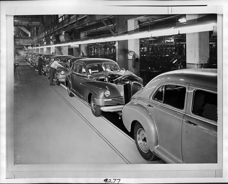 8x10 black and white Packard Co. file photograph of 1946 Packard final assembly line, three workers pictured at a car with hood open, front view of cars.