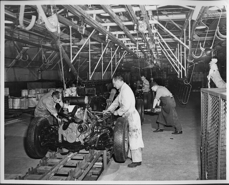 8x10 black and white Packard Co. file photograph of 1948-49 Packard chassis on assembly line, workers on either side assembling parts with large tools, engine visible, tires on. Inscribed on photo back: 1948-49 Packard super eight, twenty-second series, model 2232, 8-cylinder, 145-horsepower, 120-inch wheelbase, chassis for convertible victoria (body type #2279), first twenty-second series Packards on the line, alongside twenty-first series Clippers, spring 1947.