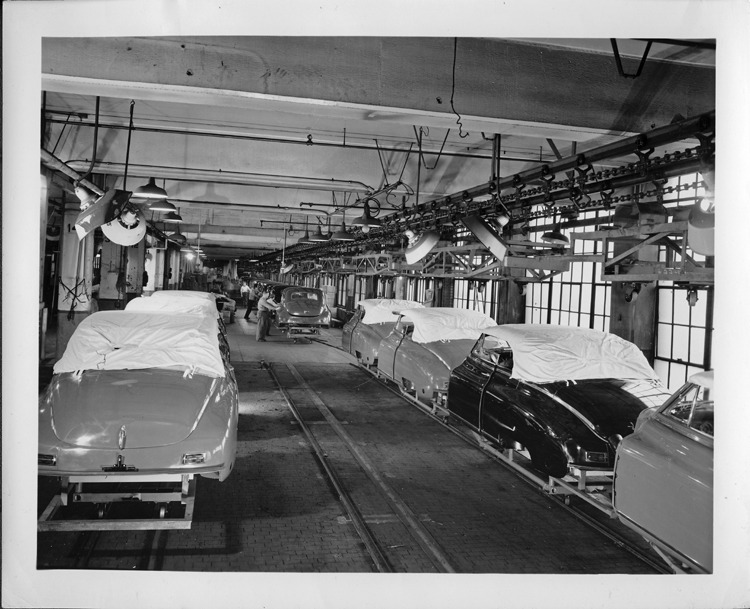 8x10 black and white Packard Co. file photograph of 1948-49 Packard bodies on assembly line, workers in background. Inscribed on photo back: 1948-49 Packard super eight, twenty-second series, model 2232, 8-cylinder, 145-horsepower, 120-inch wheelbase, convertible victoria (body type #2279), first twenty-second series Packards on the line, alongside twenty-first series Clippers, spring 1947.
