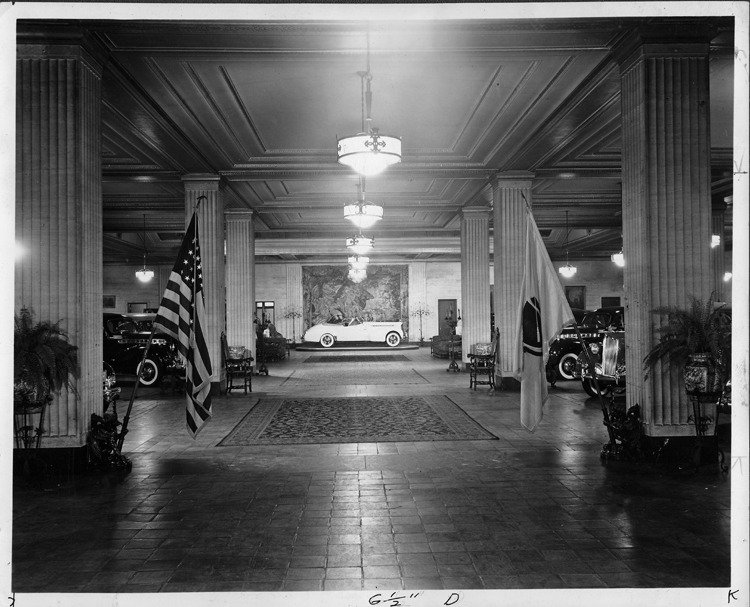 8x10 black and white Packard Co. file photograph of a Packard dealership showroom display, at end of center aisle is a convertible. Inscribed on photo back: Packard Motor Car Co., branches/dealerships/agencies, special display of 1940 Packard models; automobile in center; 1940 Packard 180 custom super 8, eighteenth series, model 1806, 8-cylinder, 160-horsepower, 127-inch wheelbase, Darrin convertible victoria (body type #700).