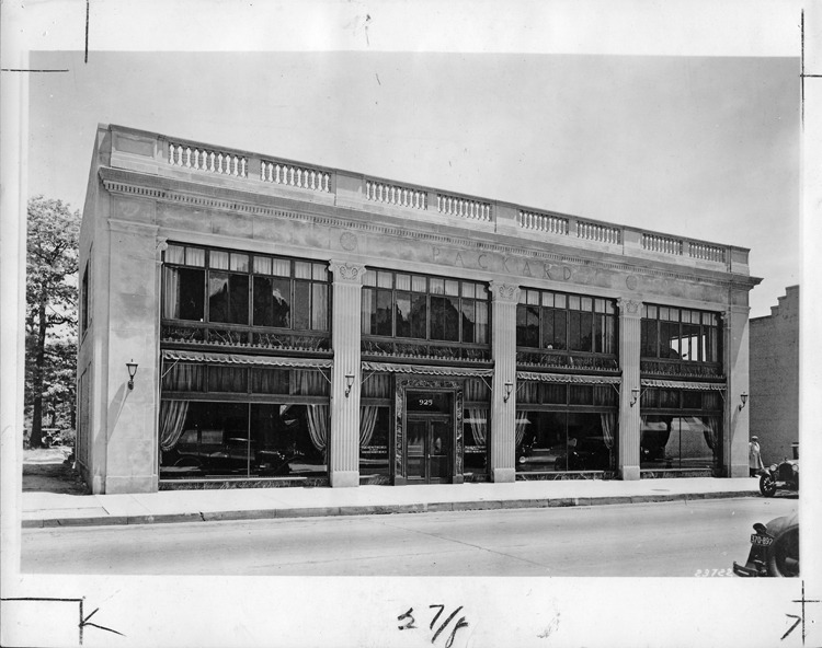 8x10 black and white Packard Co. file photograph of a Packard dealership, front of building, 'Packard' written at top of building, man standing at right corner of building, cars parked on street. Inscribed on photo back: Packard Motor Car Co., branches/dealerships/agencies, Packard Motor Car Co. of Chicago, Ill., (Hubbard Woods Branch), cars in show windows left to right; 1928 Packard sedan, 1928 Packard roadster.