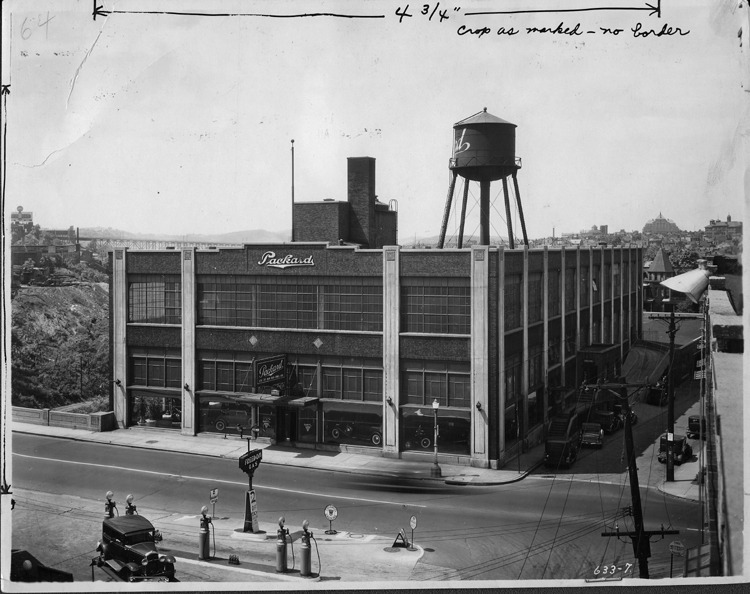 7.5x9.5 black and white Packard Co. file photograph of a Packard dealership, front of building sits on corner, water tower in background, cars parked on street, 'Packard' sign above door, cars in show windows, 'Freedom Gas' station across the street. Inscribed on photo back: Packard Motor Car Co., branches/dealerships/agencies, Packard Motor Car Co. of Pittsburgh, 4709 Baum Boulevard Pittsburgh, Pennsylvania.