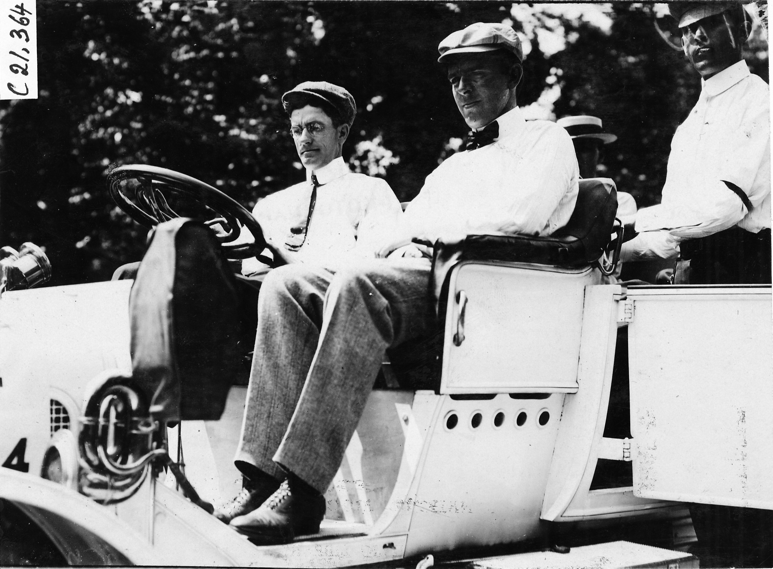 4.5x6.75 black and white photograph of a participating driver at wheel with passenger, in shirt-sleeves, wearing hats; close-up. R.H. Johnson and J.N. Searles in #14 White Steamer, entered July 10, 1909, Detroit, Michigan. Negative #C21,364.