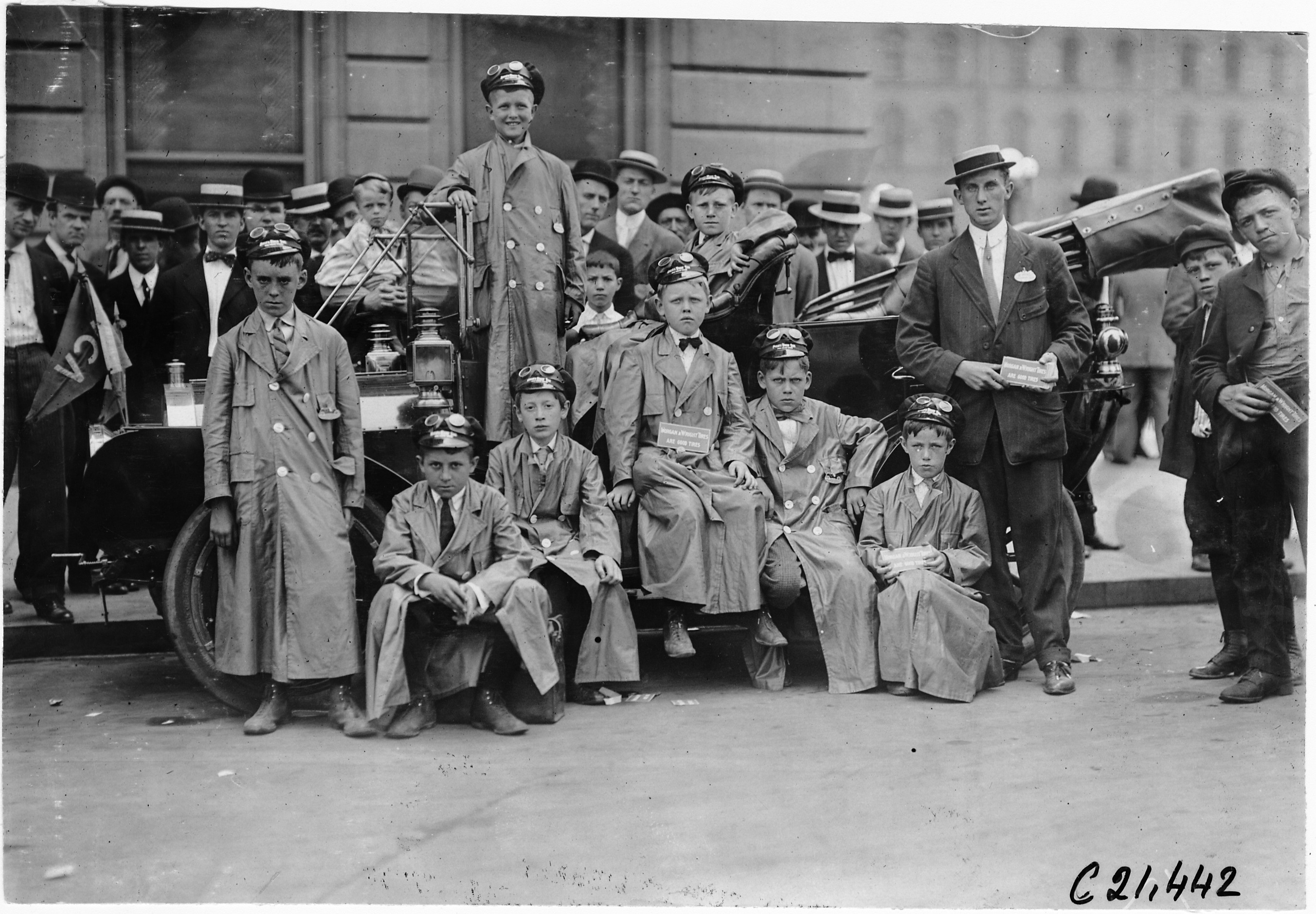 4.5x6.75 black and white photograph of a group of young boys on, and in front of, car dressed in motoring dusters, goggles and hats, holding small signs that say 'Morgan & Wright Tires Are Good Tires,' crowd standing in background. Morgan & Wright Tire 'Yellow Kids,' automobile parade at Detroit, Michigan, July 10, 1909. Negative #C21,442. Photo edges cut unevenly.