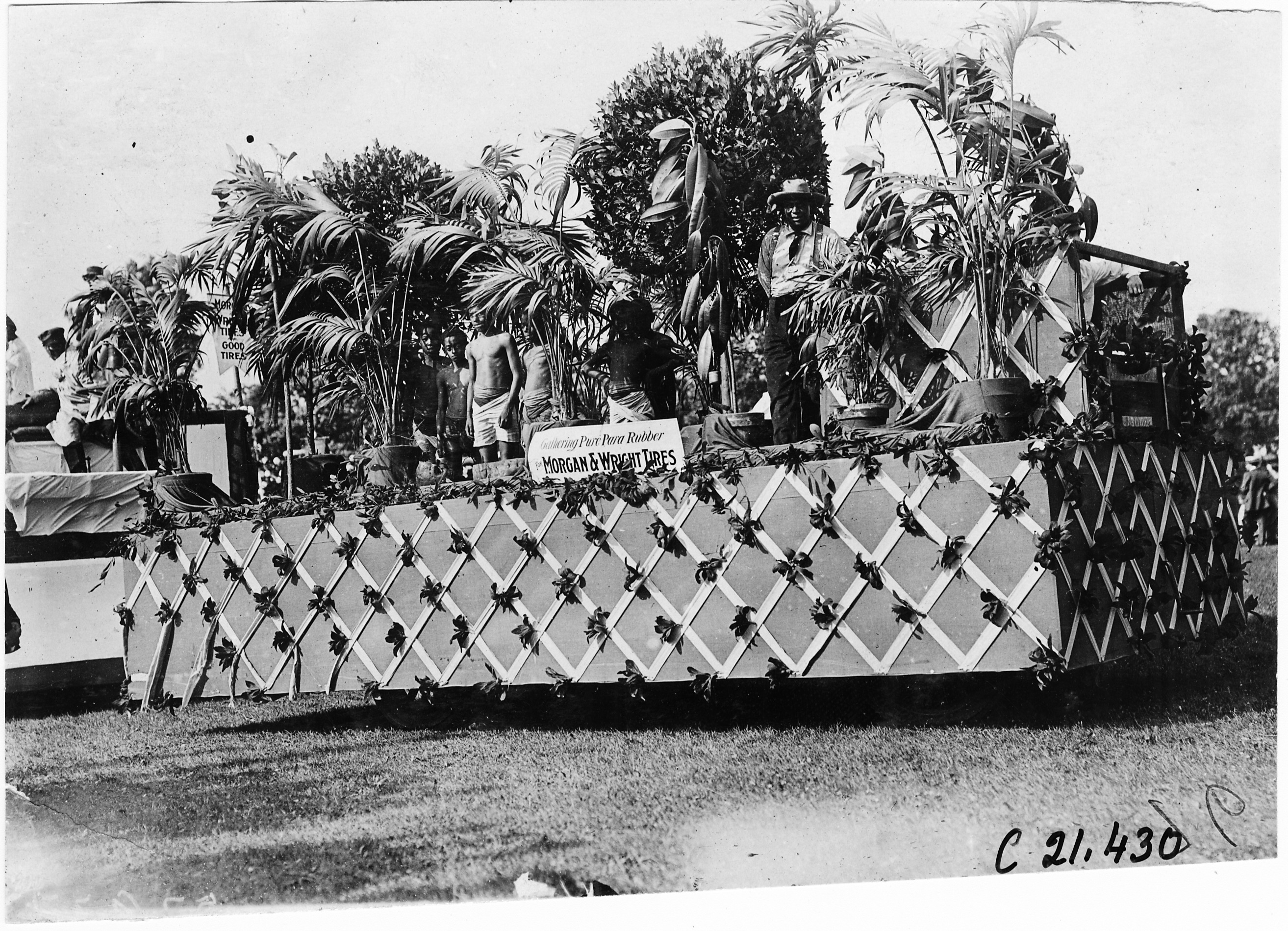 4.5x6.75 black and white photograph of a parade float decorated with palms, seven African American males in native garb on float, with sign 'Gathering Pure Para Rubber for Morgan & Wright Tires.' The Morgan & Wright float in the automobile parade at Detroit, Michigan, July 10, 1909. Negative #C21,430. Photo edges cut unevenly.