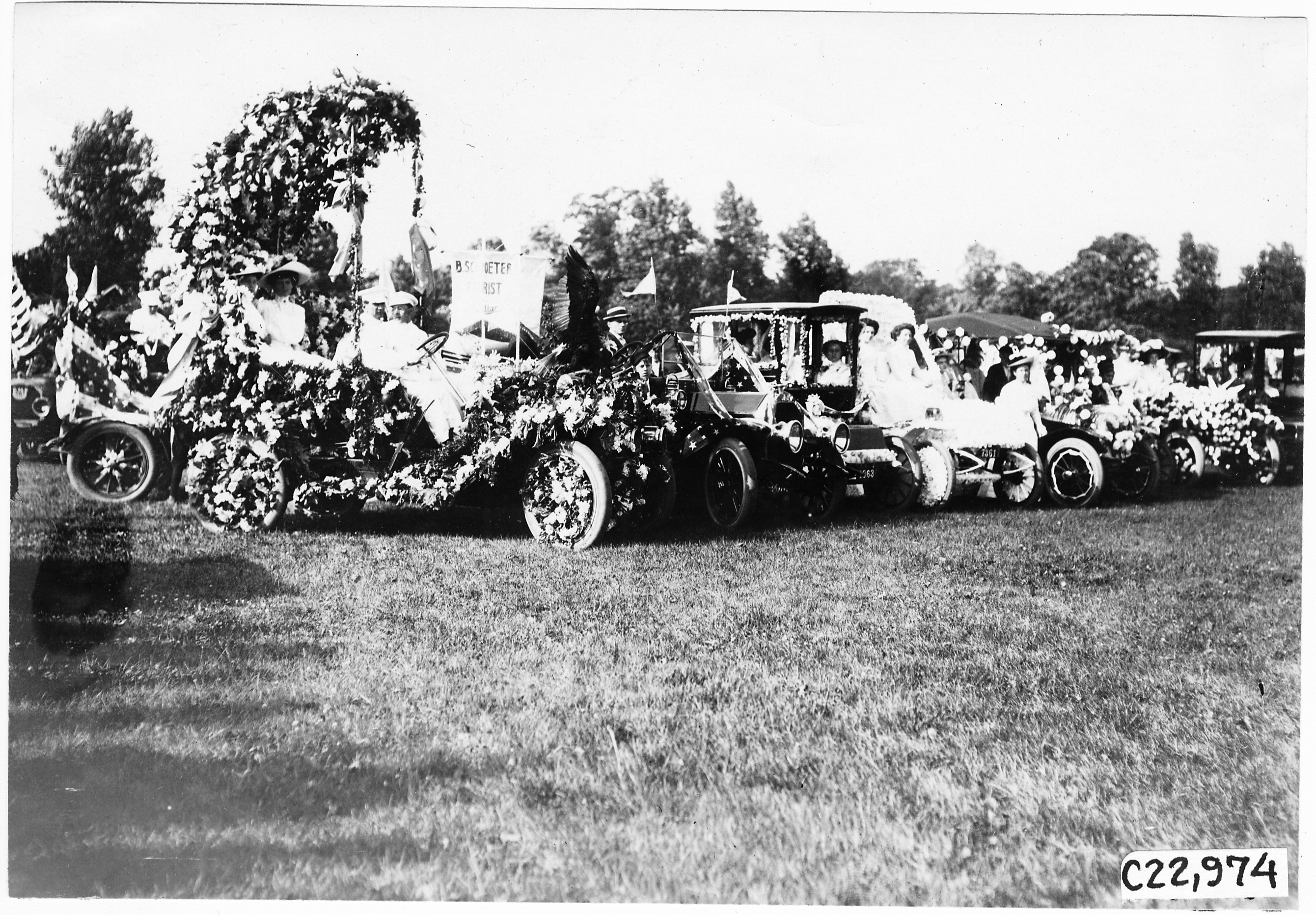 4.5x6.75 black and white photograph of row of decorated parade cars parked on grass at Belle Isle. Detroit, Michigan, July 10, 1909. Negative #C22,974. Photo edges cut unevenly.