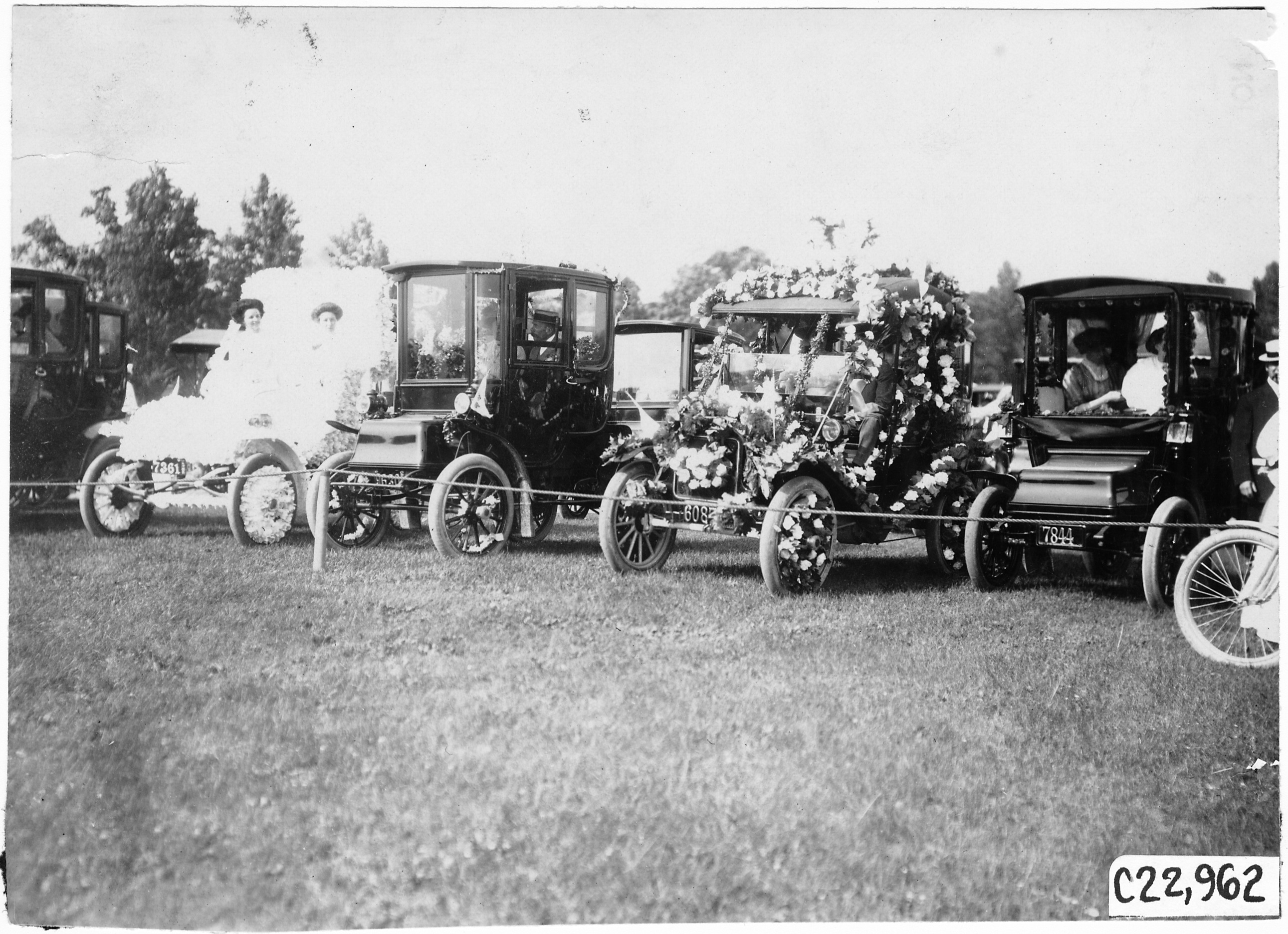 4.5x6.75 black and white photograph of four decorated parade cars lined up, decorated with flowers, parked on grass field on Belle Isle, Detroit, Michigan, July 10, 1909. Negative #C22,962. Photo edges cut unevenly.
