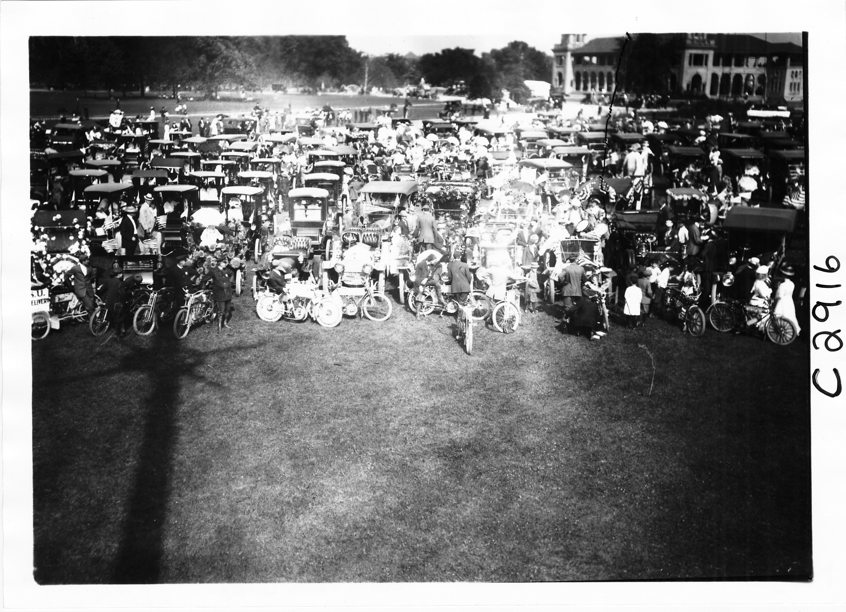 4.5x6.75 black and white photograph of parade cars parked on grassy field in front of Belle Isle Casino, some bicycles in front, two policemen to the left, Detroit, Michigan, July 10, 1909. Negative #C2916.
