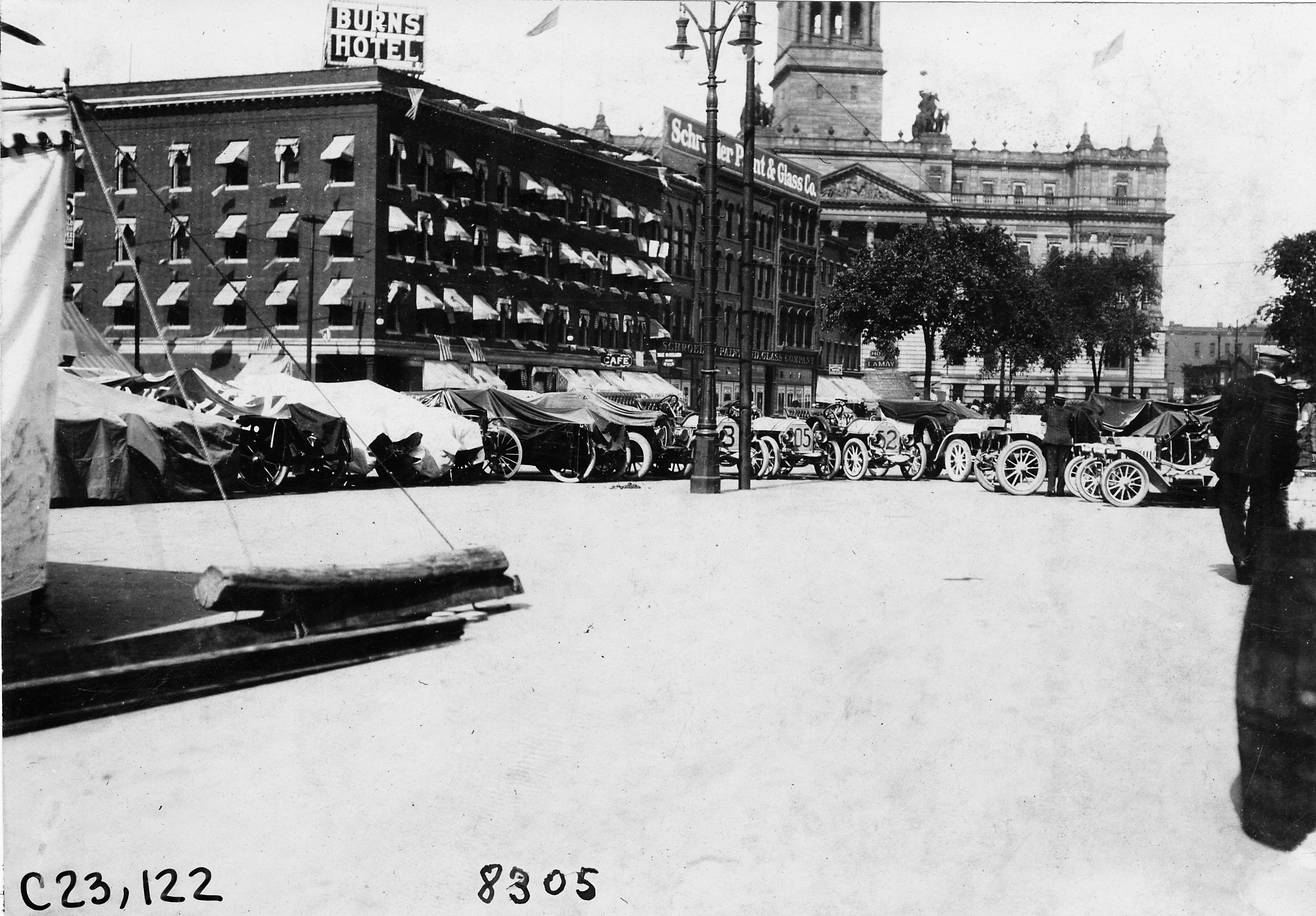 Glidden cars camped in Detroit before start of 1909 Glidden Tour, Detroit, Mich.