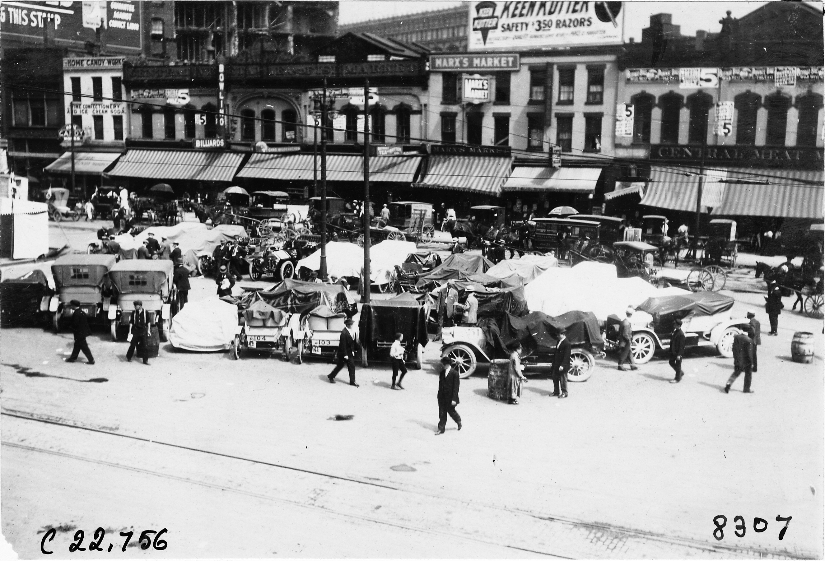 4.5x6.75 black and white photograph of a several participating cars, some covered, Central Market in background, including Marx's Market, men milling about. Detroit, Michigan, July 1909. Negative #C22,756.