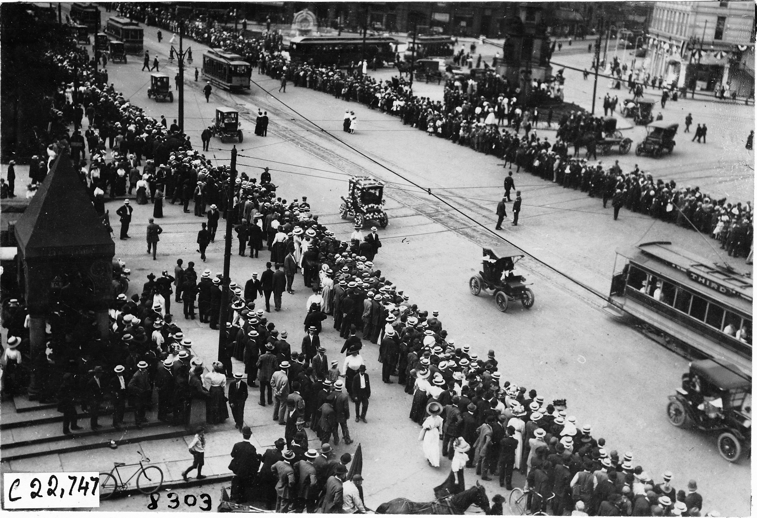Automobile parade in Detroit before start of 1909 Glidden Tour, Detroit, Mich.